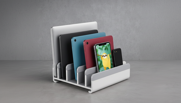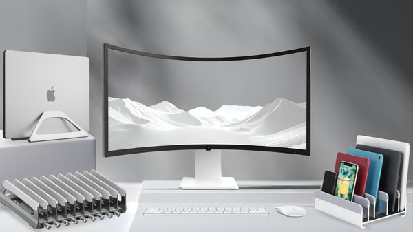 This is a desktop stand which can vertically hold your laptop, iPad, tablet, Chromebook, or whatever. It can fit devices up to 1.5" thick so it can hold almost anything. I've got an 11" iPad in a super-thick rugged case that works really well in it, actually, but it holds a Macbook Pro just as well, too. It is nice to be able to store them vertically so they don't use up so much desk space when laying flat.
