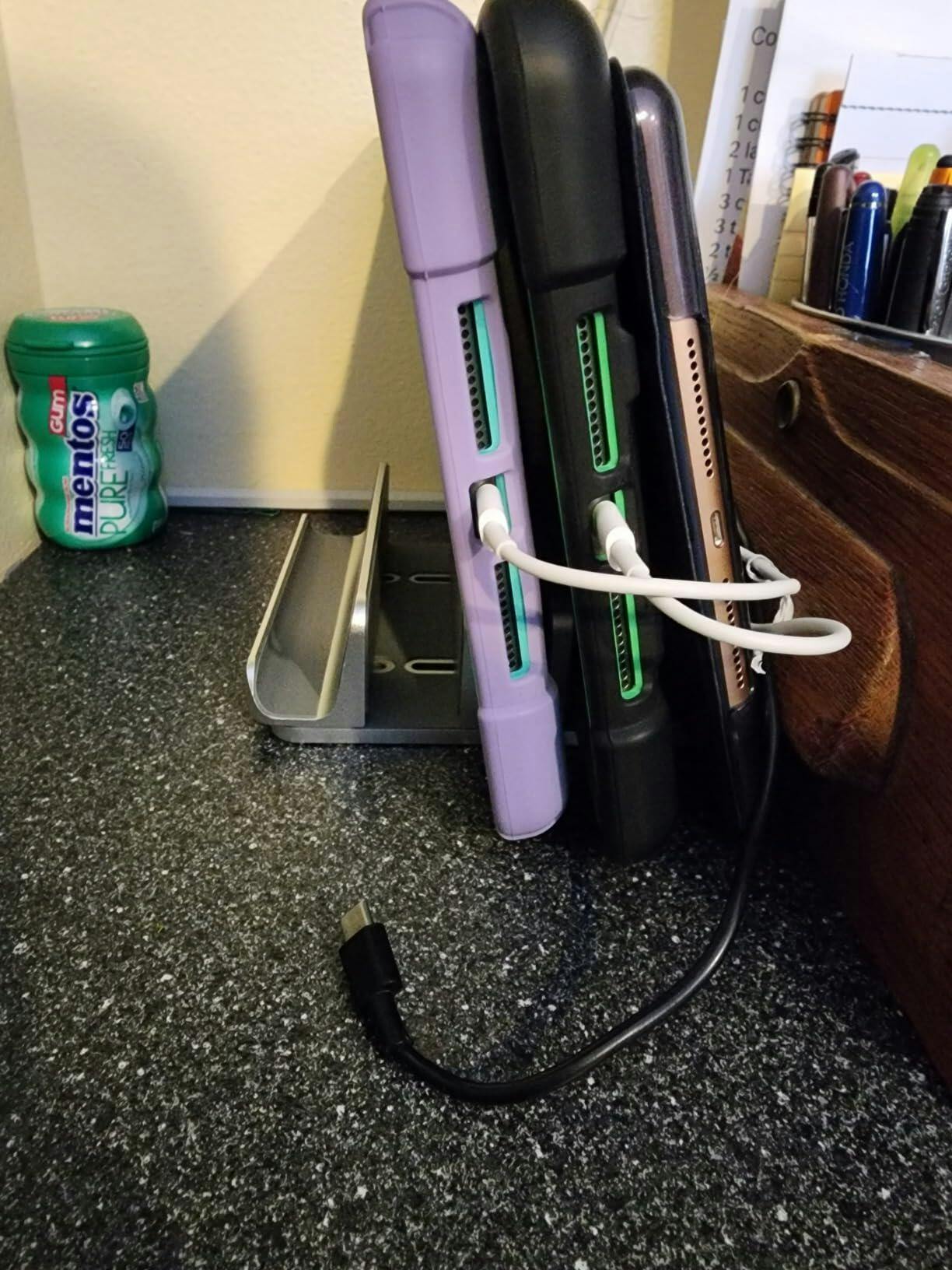 We have a variety of tech devices in the household. I have been looking for a way to better organize them aside from just piling them on top of each other. Especially when charging. This holder works perfectly. It's worth noting that the stand is adjustable. Included are 2 additional screws that can be used with the included Allen key to loosen or tighten the stand depending on the size of the device you're stacking. It's worth noting that I had to replace 2 screws immediately as there were 2 that were already "rounding" when loosening them. Because they were included, I just swapped them out immediately. after learning the hard way on adjustments; I found the easiest method was to insert the tech device with the screws loosened, clamp the device in the stand and back it out just slightly to allow a little wiggle room to slide between the slots. Then just tighten and it fits well. The 2 end slots, while functional, are not as effective as there's no vertical slot to hold the end devices in place. This does limit what you can or would want to put there. For example, I would not want to place the laptop into one of the end slots for fear it may fall over due to weight. Albeit, having up to 5 devices in a single stand is very functional.