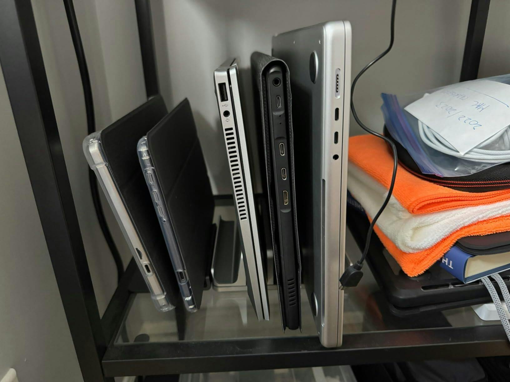 I have a lot of laptops and portable monitor screens that keep in the office for quick access. This holder works well for it because it has space for up to five devices, and the depth / thickness is adjustable. It took a little while to adjust all the spacing to match my laptops, but the end result is good.